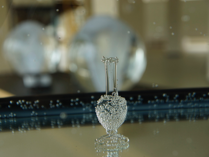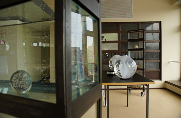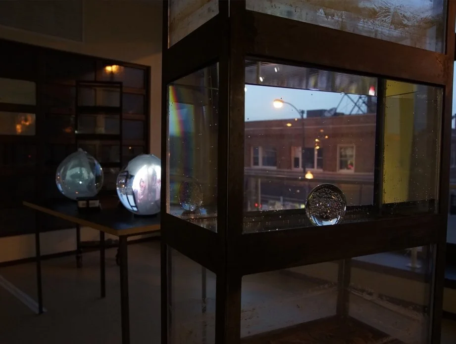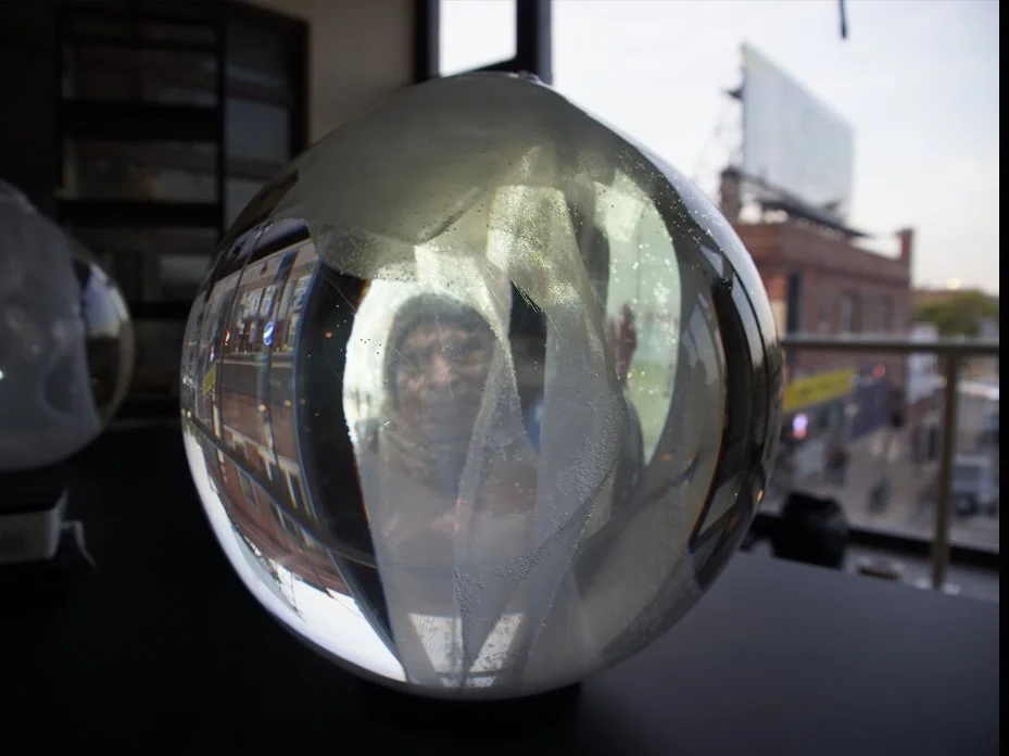 Table, video projection, hand blown glass spheres, fabric, water from the Ganges, Yamuna and Saraswati Rivers. Part of the Decomposition of Memory project.