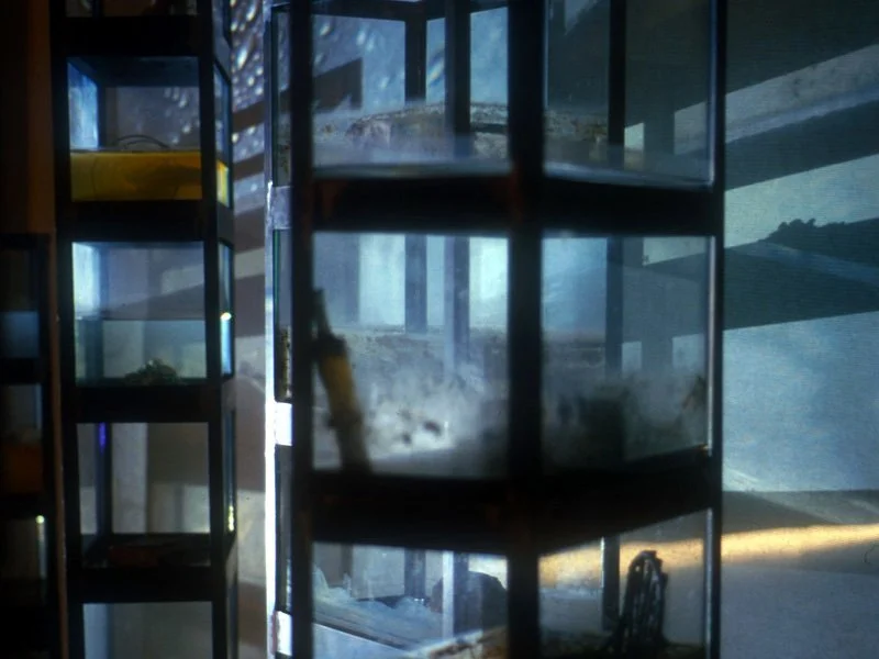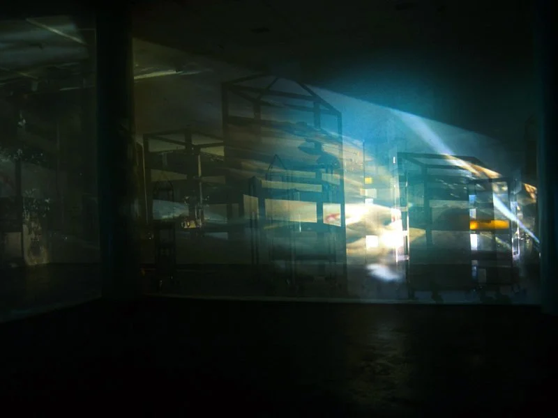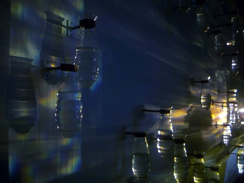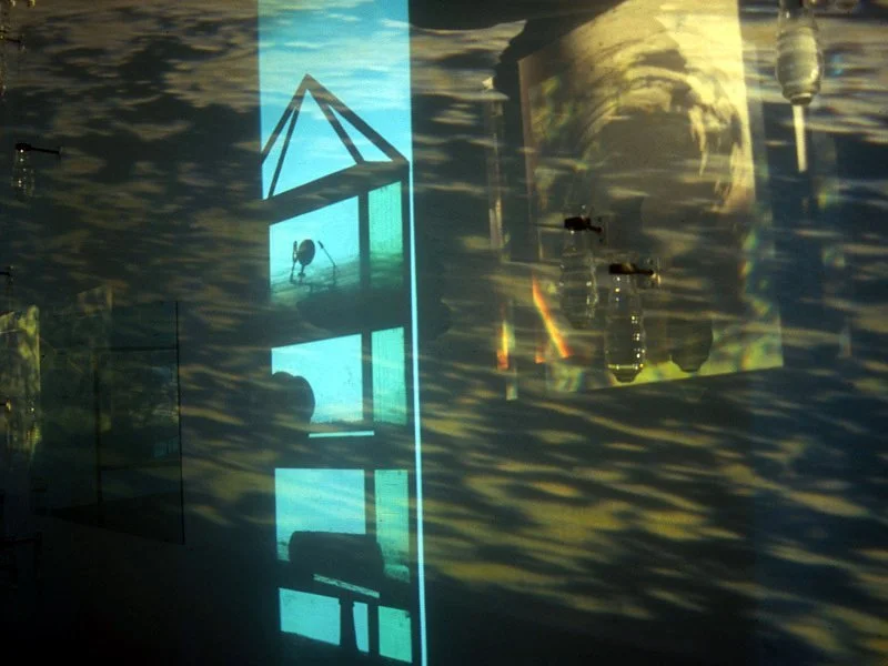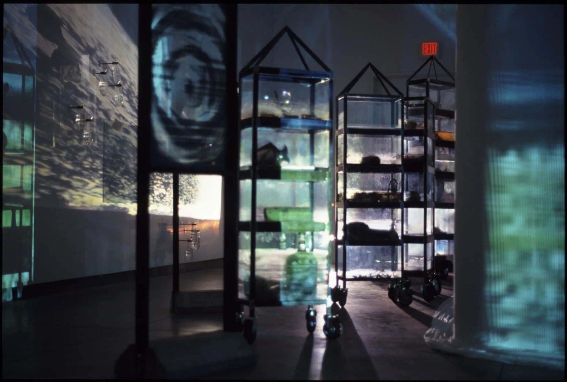 Film projection, glass tanks, found objects, collected water from X, hand-blown glass vessels, sound and exhibited at the Institute of Contemporary Art at the Maine College of Art & Design in Portland, ME, 2005