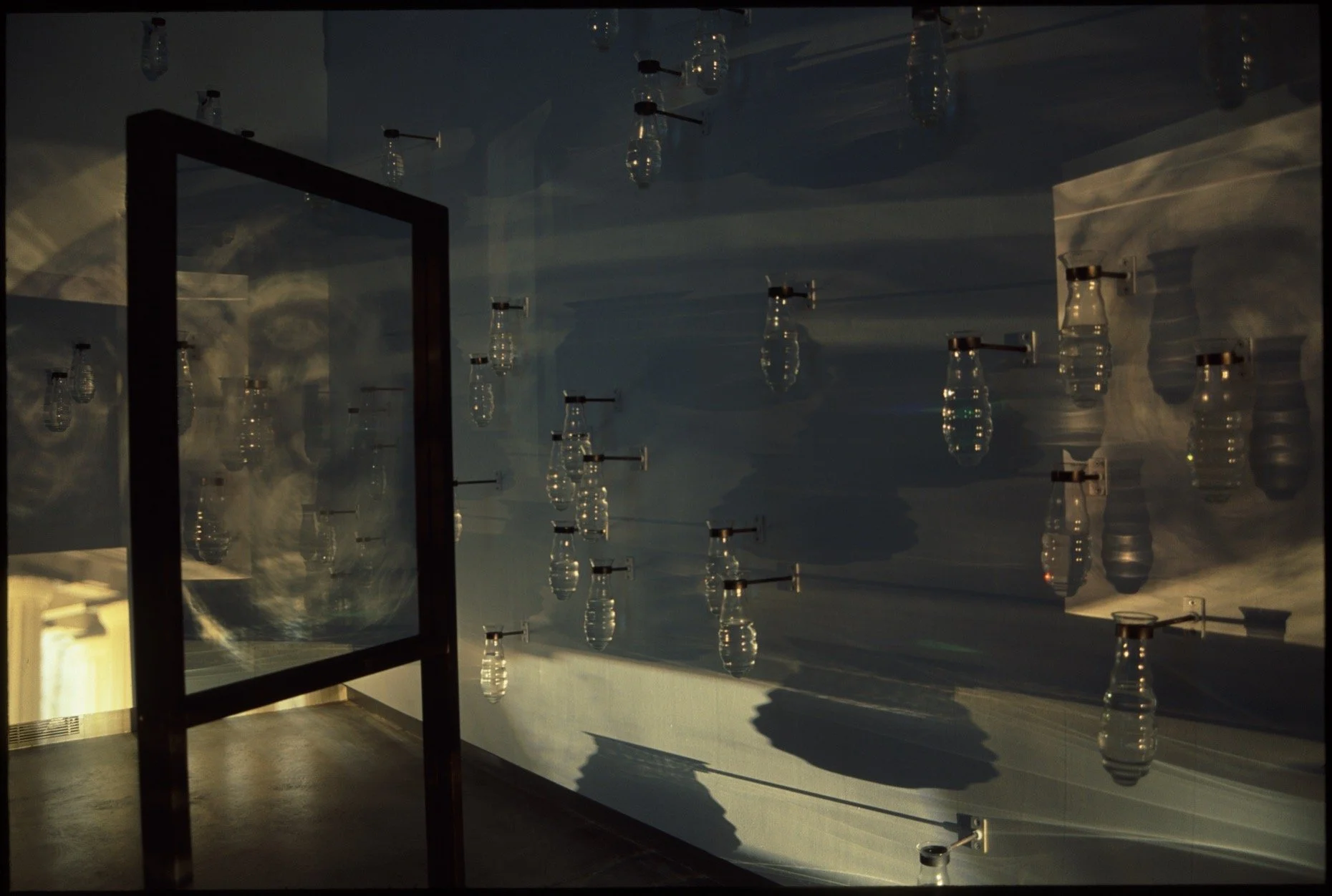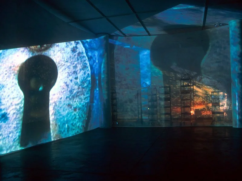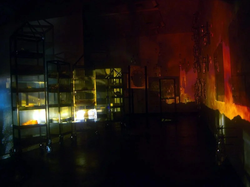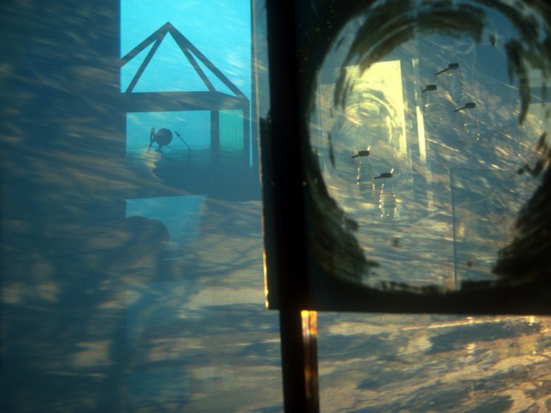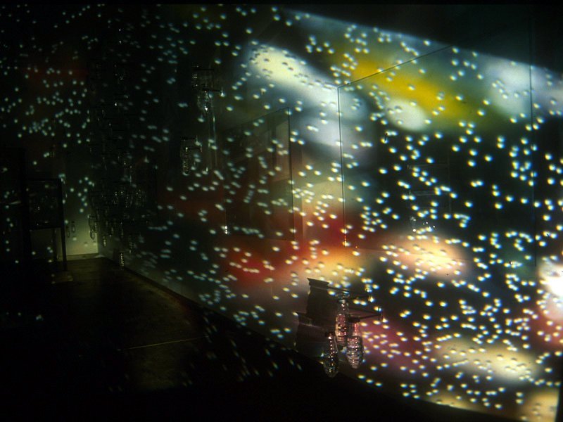 Film projection, glass tanks, found objects, collected water from X, hand-blown glass vessels, sound and exhibited at the Institute of Contemporary Art at the Maine College of Art & Design in Portland, ME, 2005