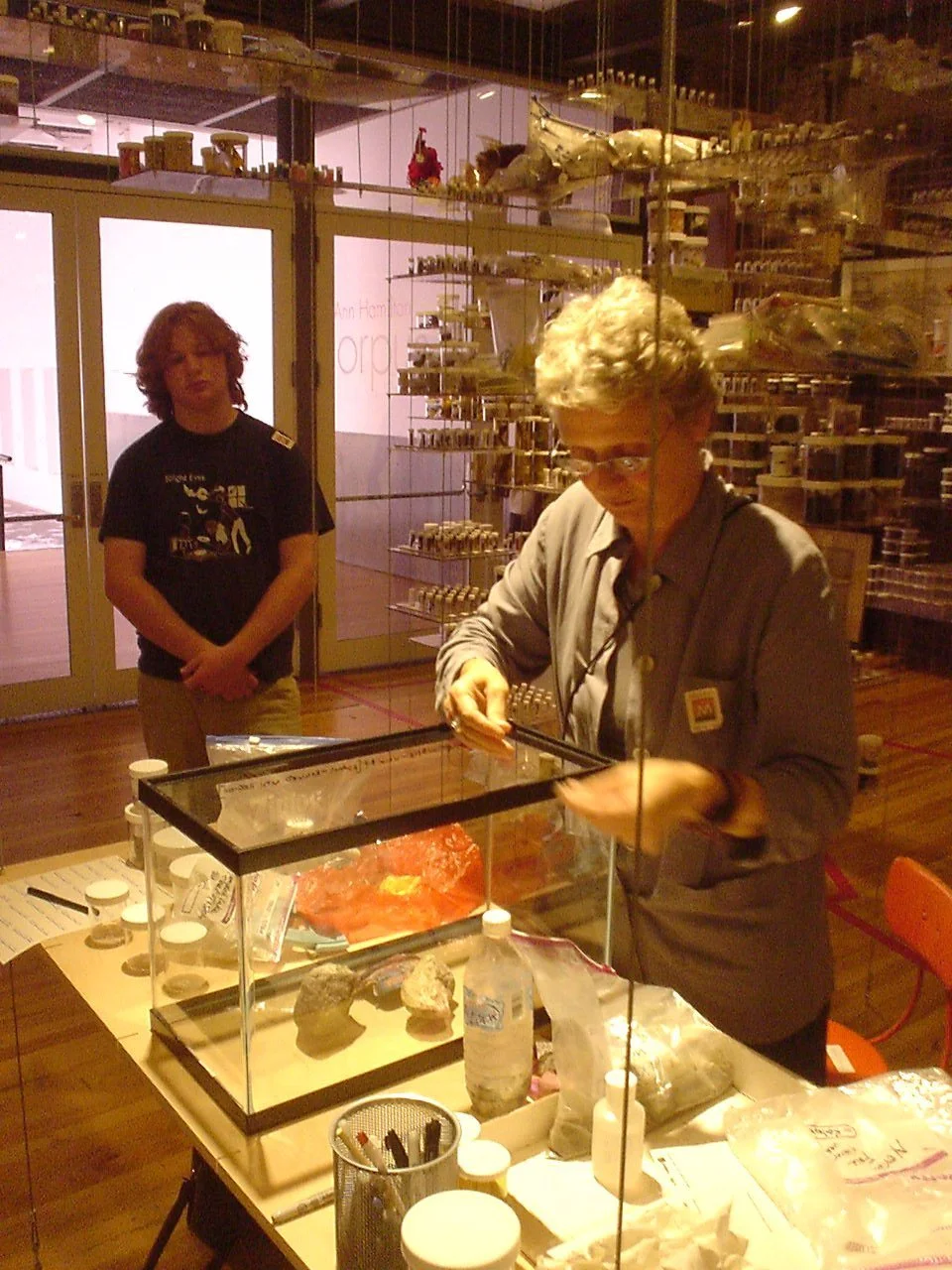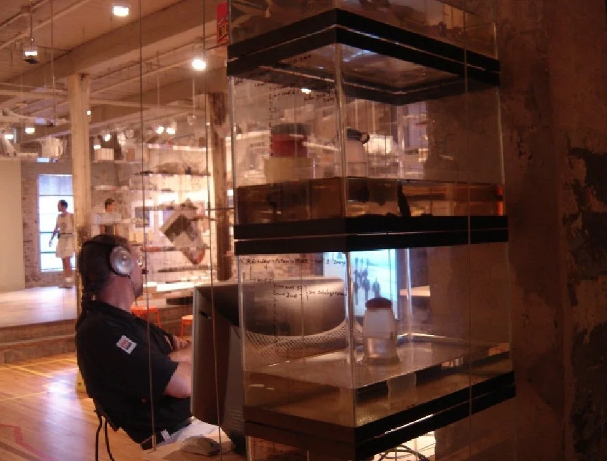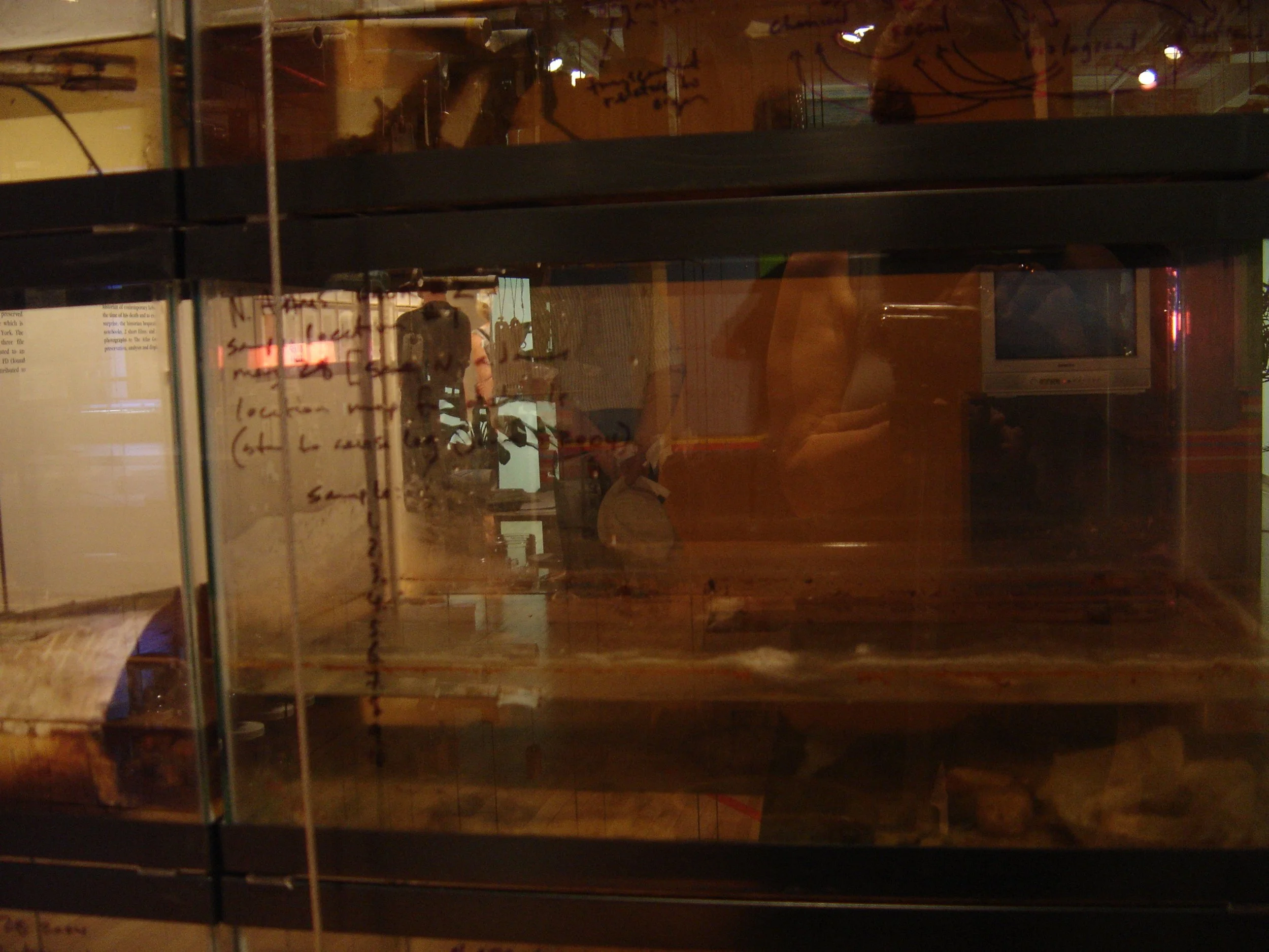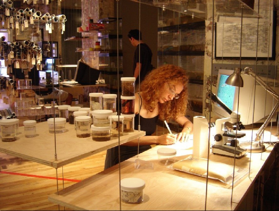 The Experimental University: Artists in this section used anthropology, biology, geography, and other scientific disciplines for artistic or political purposes, rather than for scientific goals. By taking experiments out of the laboratory and placing them in new contexts within the museum or on the sidewalk, these artists seek to give viewers access to new information, and the capacity to reach their own conclusions about technical or environmental matters that might otherwise seem remote and untouchable. Artists included: 16 Beaver, Critical Art Ensemble with Beatriz de Costa, Tana Hargest, J. Morgan Puett, Spurse, subRosa, and The Atlas Group.