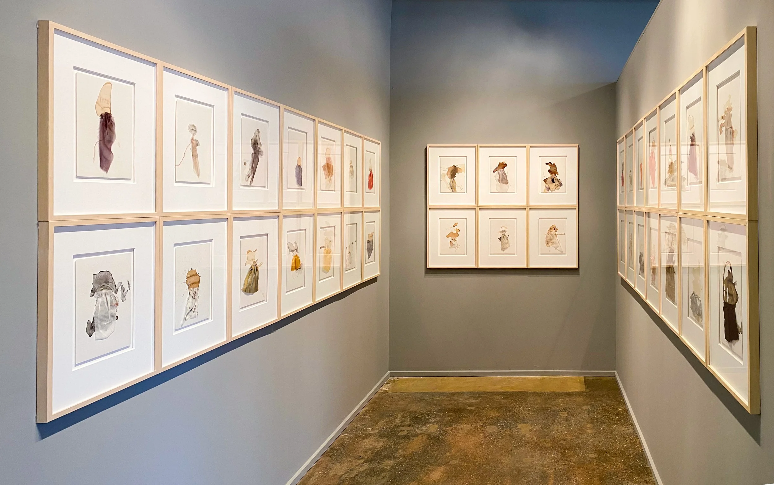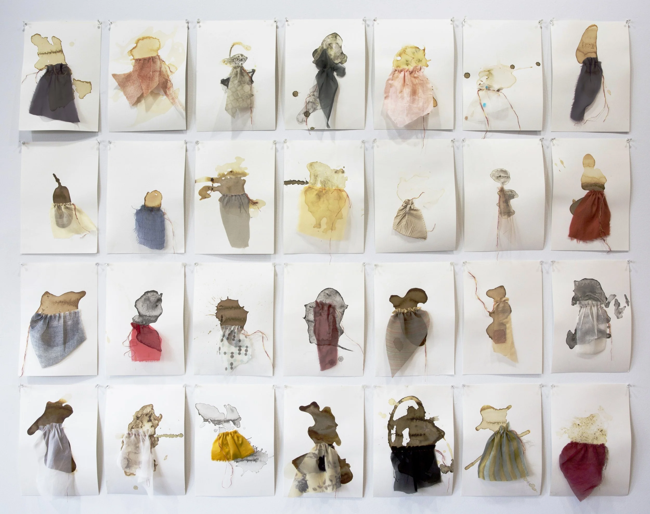 When the process reaches a point of saturation, the liquid and remaining matter are poured onto sheets of paper and allowed to settle, spread, and form their own shapes. Gravity, time, and chemistry determine the composition.