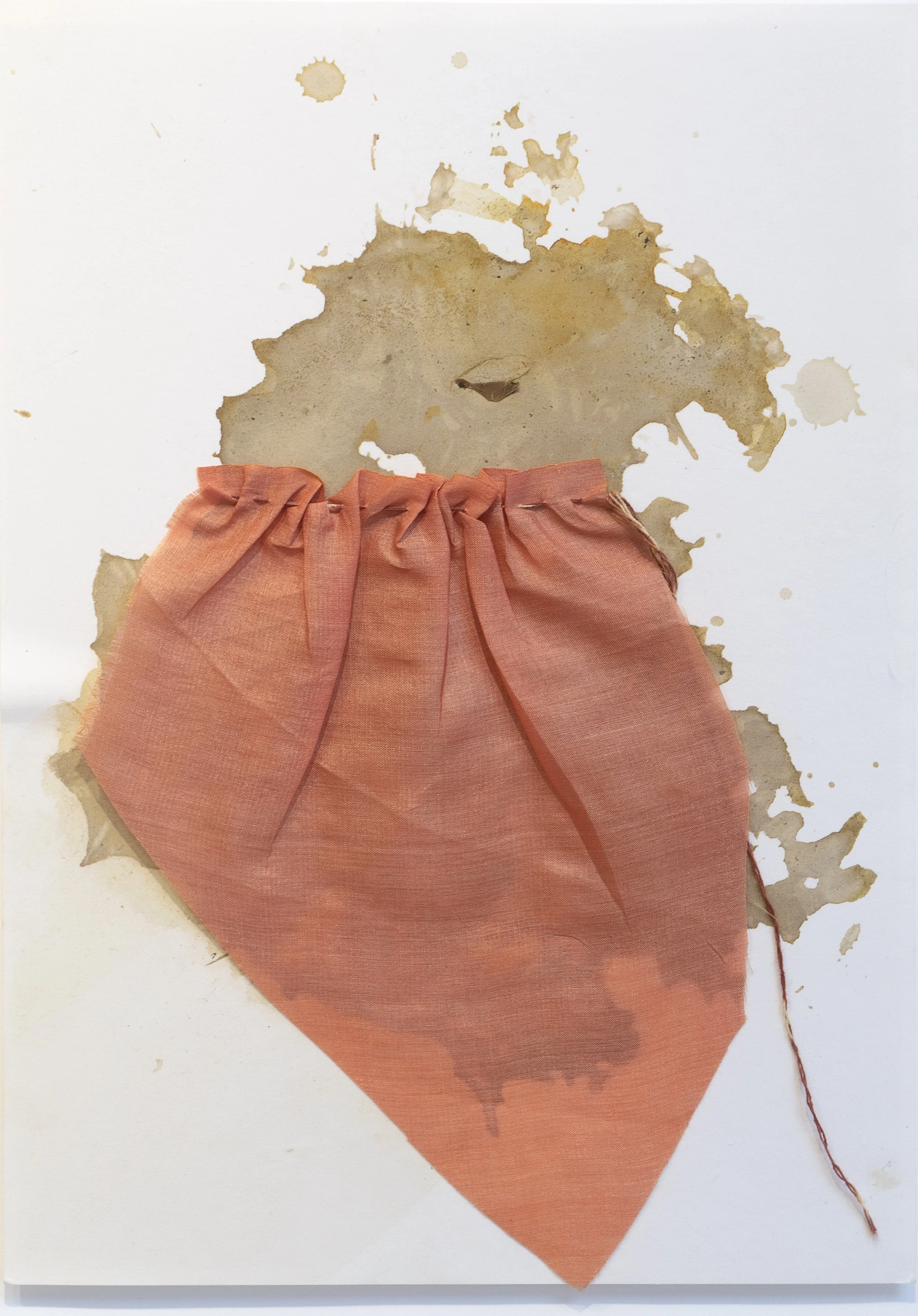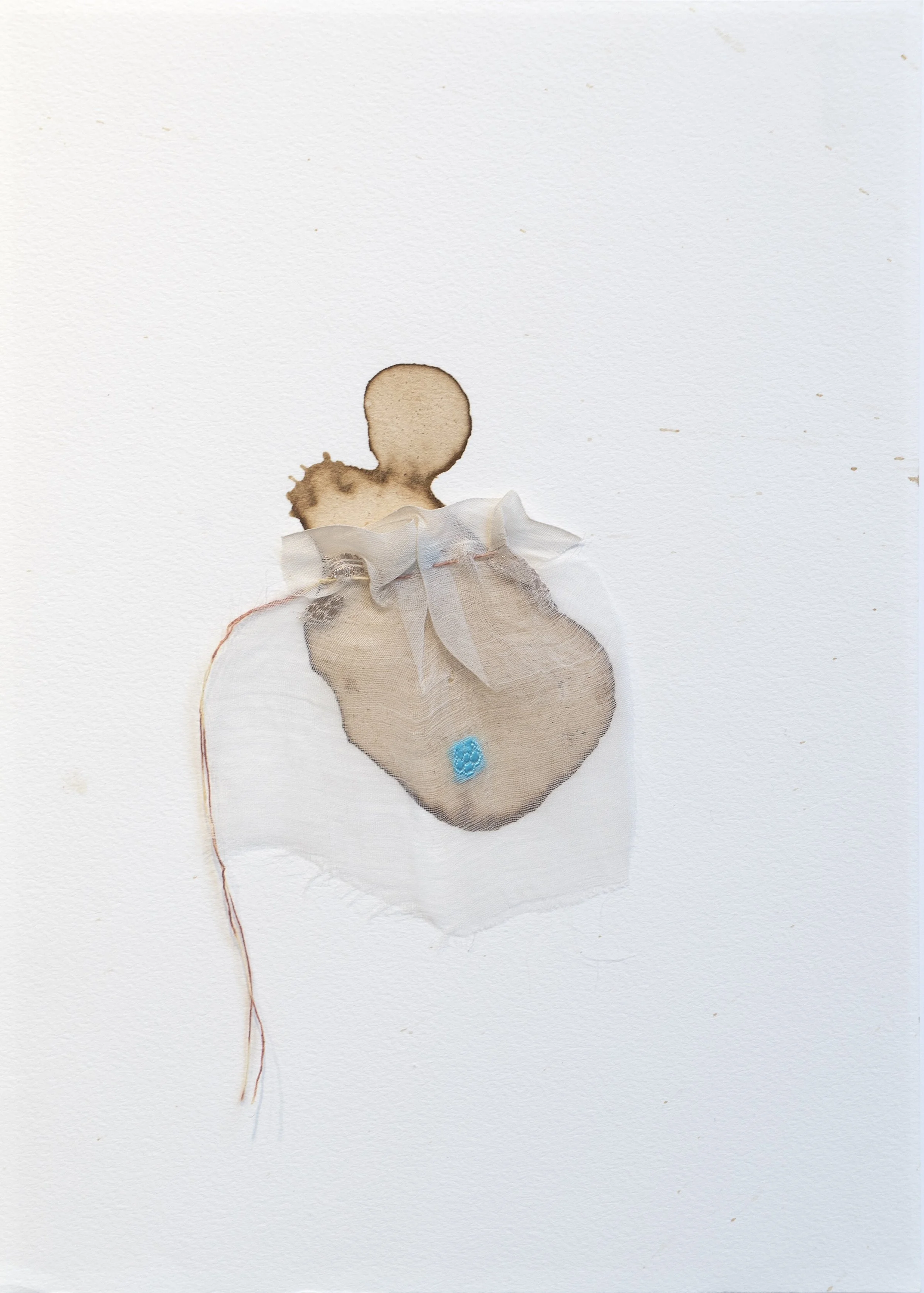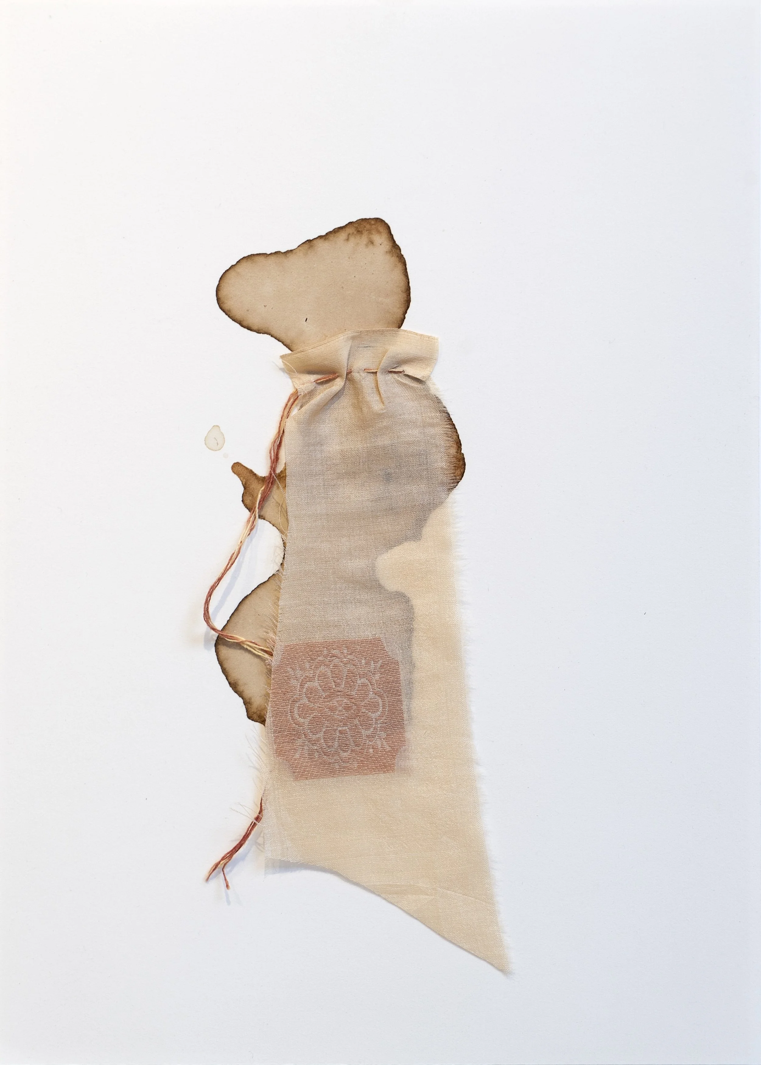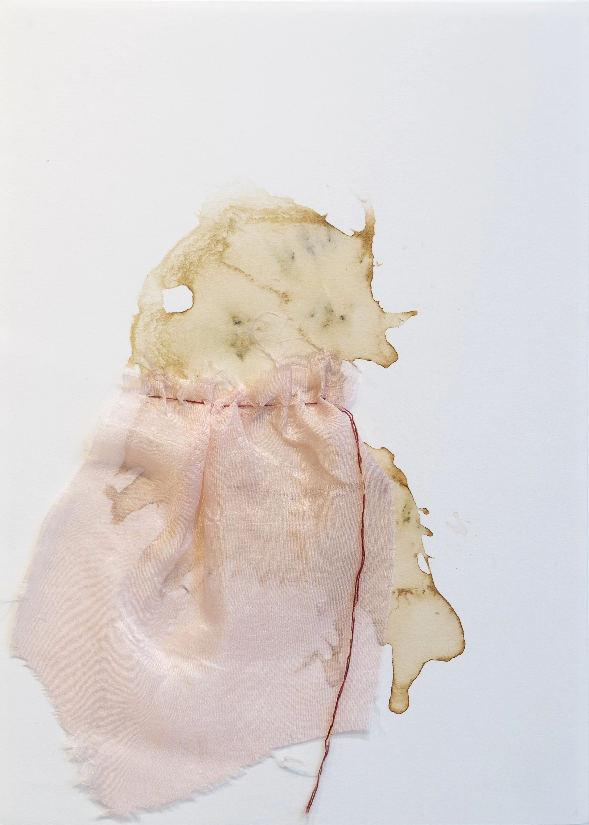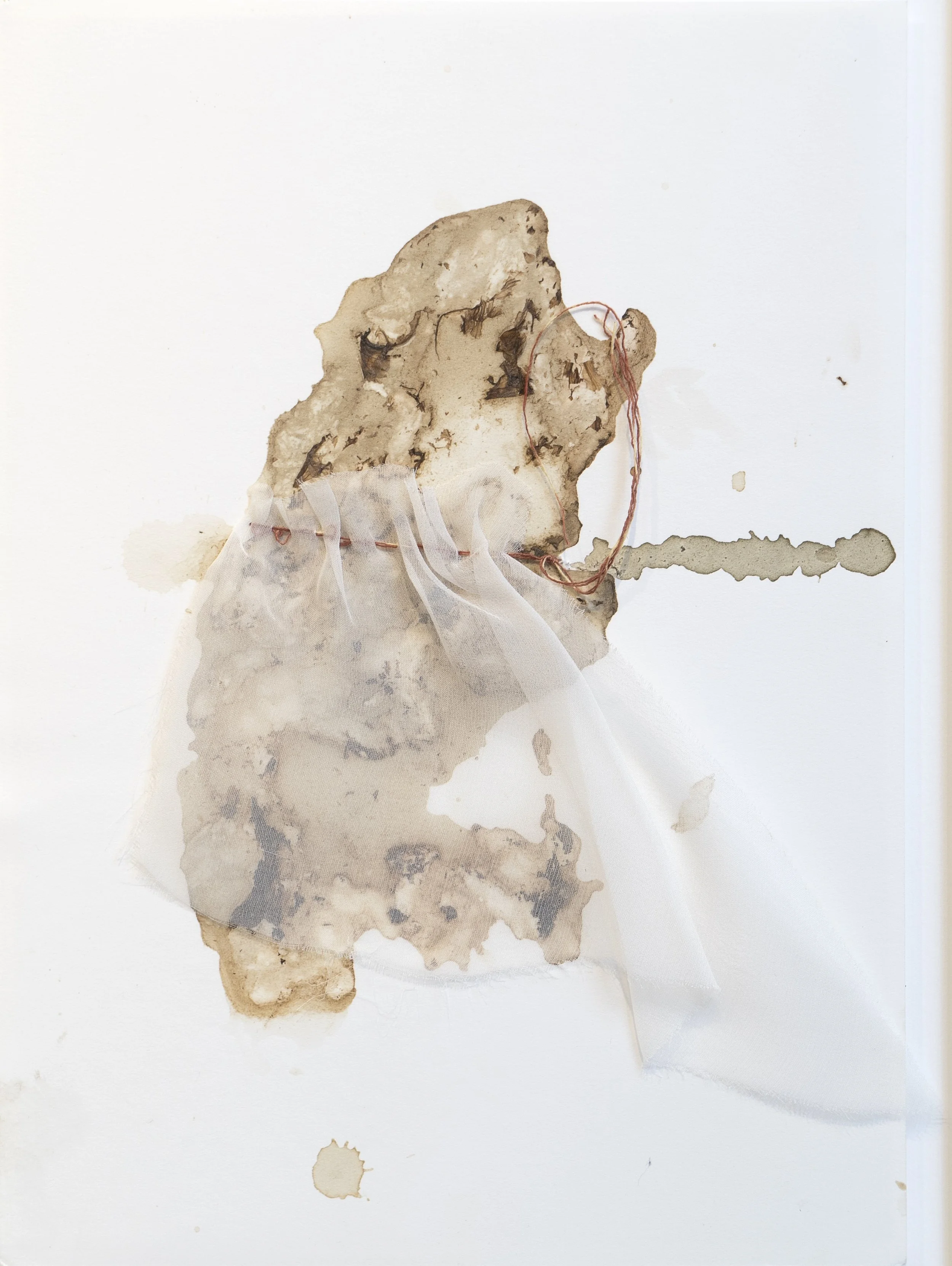 Months later, back in my studio, I hand-sew small pieces of silk onto each sheet as a gesture of protection—an act of care rather than repair. The works hold traces of exchange—offering and return, devotion and response—without representation. They remain quiet records of a process shaped by walking, place, time, and transformation.